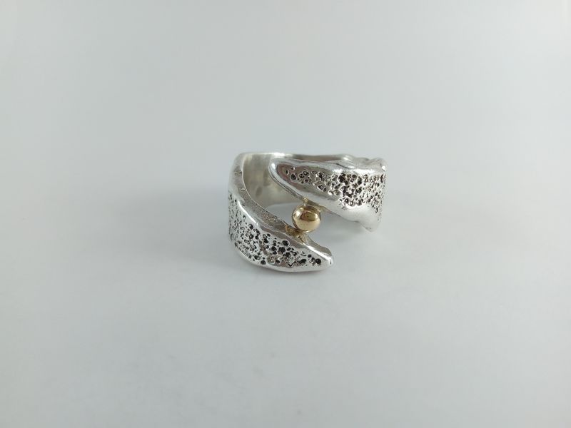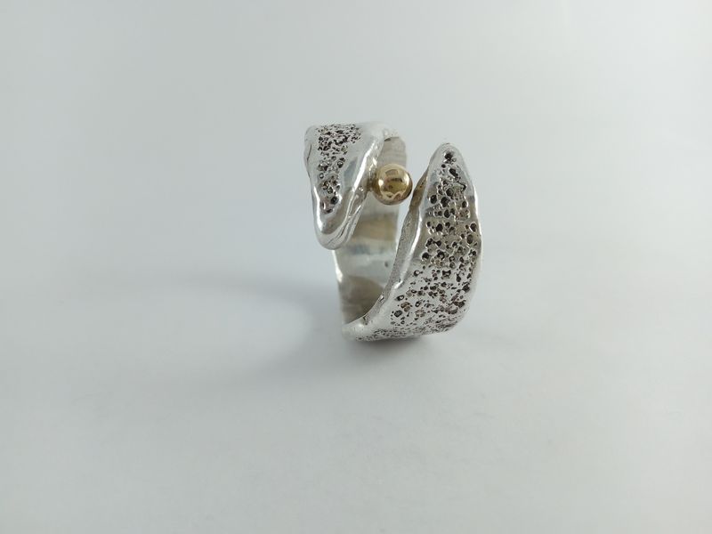 Anillo de plata con detalle en oro de 18 K. En su parte más ancha mide 17 mm.